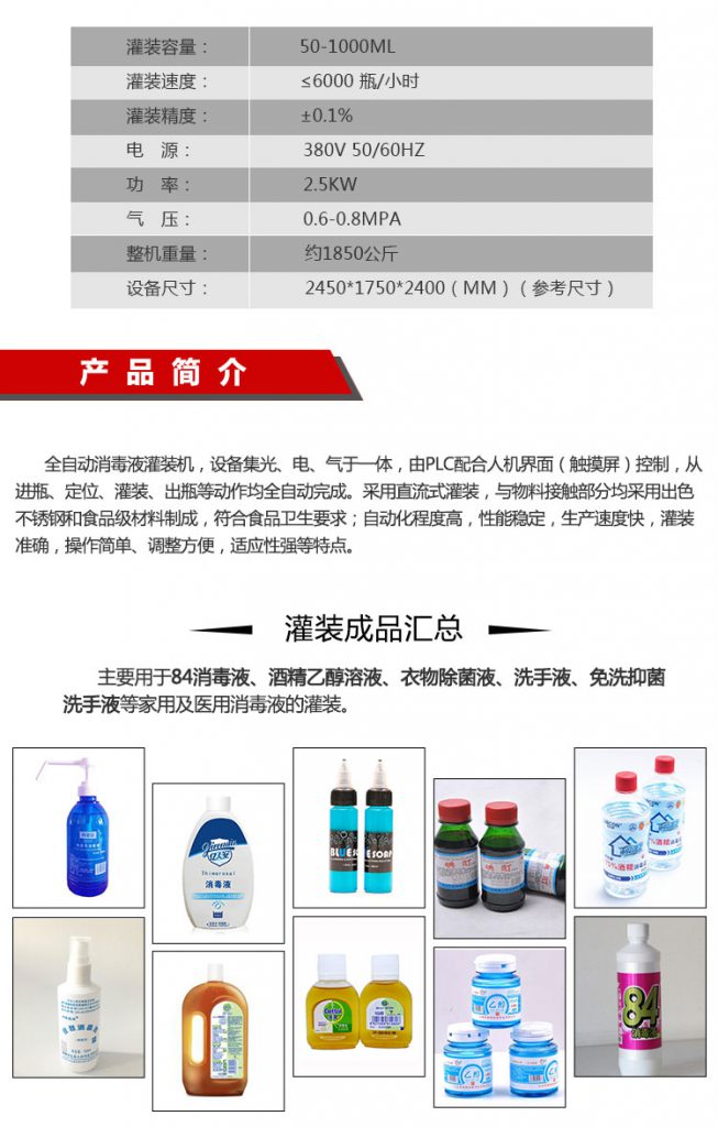 灌裝物料: 消毒溶液,酒精,84消毒水等各種低粘度溶液