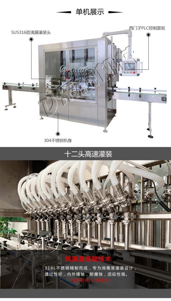 醫(yī)用酒精消毒液灌裝機(jī)主要用于洗液、護(hù)理液、口服液、消毒液、洗眼液、營(yíng)養(yǎng)液、注射液、農(nóng)藥、醫(yī)藥、及特殊行業(yè)的液體灌裝。